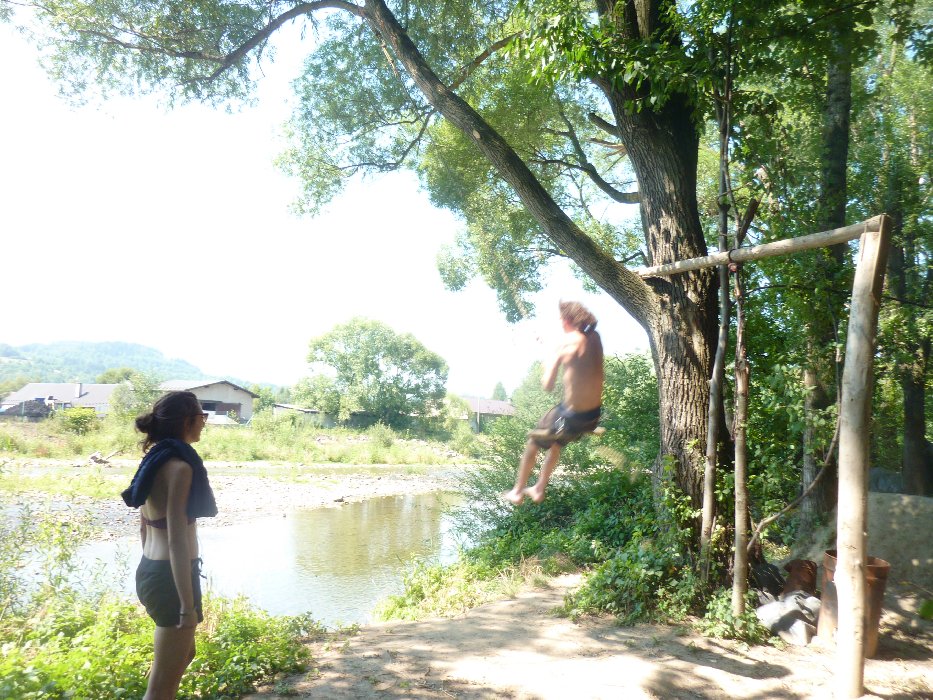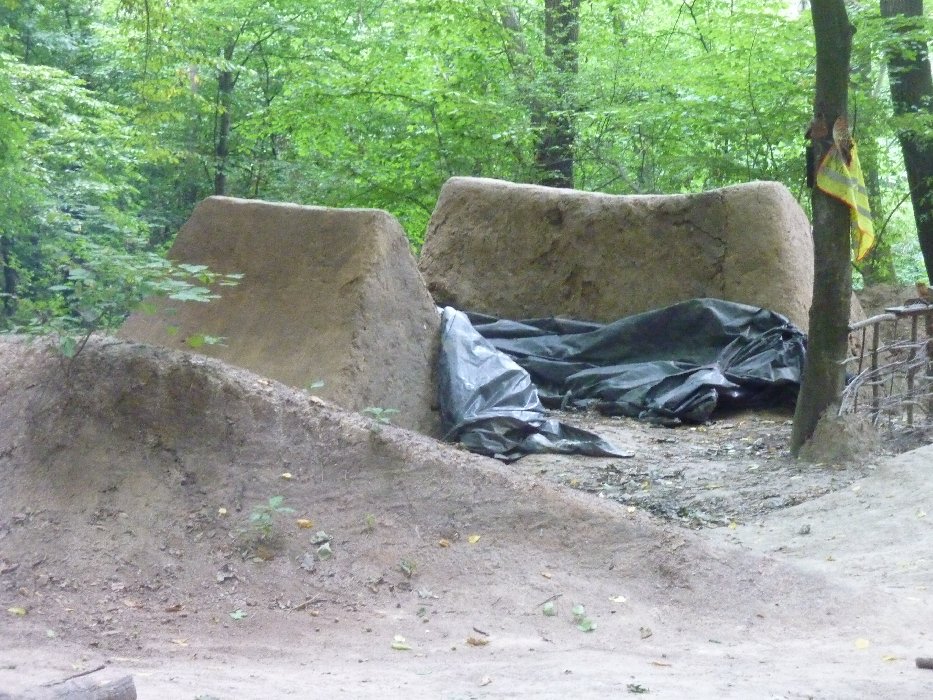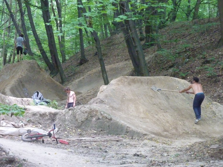 Le lendemain après-midi nous avons du partir même si nous serions bien restés plusieurs jours. Jela nous a trouvé un bon plan sur la route de Praque Zywieck si je me souviens bien est une petite ville au bord des montagnes où Krysiek encor 1 type en VTT bon creuseur. Habitant à quelques centaines de mètres de son champ de bosses il préfère y rester vivre et dormir la plupart du temps pendant certaines périodes. C'est le "RIVER TRAIL" bien situé donc mais le problème c'est comme d'autres champs des bosses au bord des cours d'eau: ça inonde. Gros pumptrack et 1 belle ligne. Le coin est vraiment sympa, avec possibilité de se baigner dans la rivière, barbecue, hute,au calme d'un bois où tout à l'air construit dans un bon esprit nature, un champ de bosses quoi. Merci à Krysieck qui était bien content de recevoir des gens venus de loin.