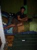 Arrivé au camping Lalo nous dit que 2 des filles qui ont de l'argent ont loué une maison par ce qu'elles ont eu trop froid la veille et qu'on va dormir là bas, donc on y va et tout le monde suit on a fait la soirée là bas, tout le monde est bien content surtout Sylvain il est déchainé... Moi je reste un peu dans mon coin vu que je comprends rien et je regarde tout le monde, c'est bien marrant, mais bon à un moment j'avais qu'une seule envie c'est d'aller me coucher, et vu que dans la maison c'est le bordel je préfère aller dormir dans la tente tranquille. Arrivé à la tente j'entend Sylvain parler en fait il a mis une heure à chercher son sac alors qu'il l'avait amener à la maison, une heure après alors que je dormais je me suis réveillé avec un Sylvain qui fouille dans mon sac, je lui demande ce qu'il veut, il avait faim, il cherchait les ayouas (des petits pains) qu'on avait acheter le matin.