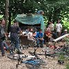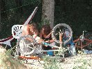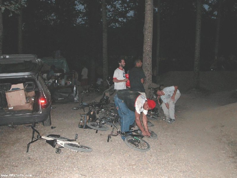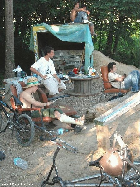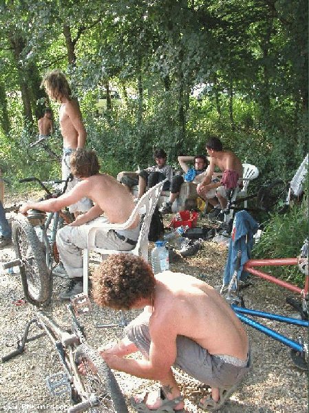 On commence a se diriger vers le trail autour de 16h. Le trail est a 10 minutes en voiture de chez David. Arrivés la bas, il y a déjà un peu de monde. On commence a faire le tour du champs de bosses, avant de nettoyer et mouiller les bosses. Mais il fait encore chaud, donc on a pas mal discuté avant que deux trois mecs se motivent pour rouler malgré la chaleur... petit à petit, tout le monde a suivi. Pendant ce temps, David et Sylvain préparent le punch, le groupe électrogène, et les lumières...d'autres préparent déjà le feu pour le soir, et David passera une bonne partie de l'après midi en bagnole sous le soleil à chercher tout le matos pour la fête !
