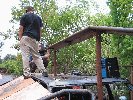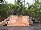 Apres la contruction de la reception, on a fait une petite pause tout en regardant Chris Hallman qui commençait a faire un gros tas de pallette en face du wall incurvé que Chicken et deux trois mecs avaient presque fini. Avec Vince, on a commence a aider Chris Hallman a faire sont gros tas de bois dont le nom sera le \"doritos\" ou \"the ramp of insanity\" :-) et donc on a commence a empiler et clouter tout ca et au debut ca a eu du mal a prendre forme mais le resultat fut pas mal du tout.