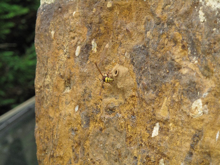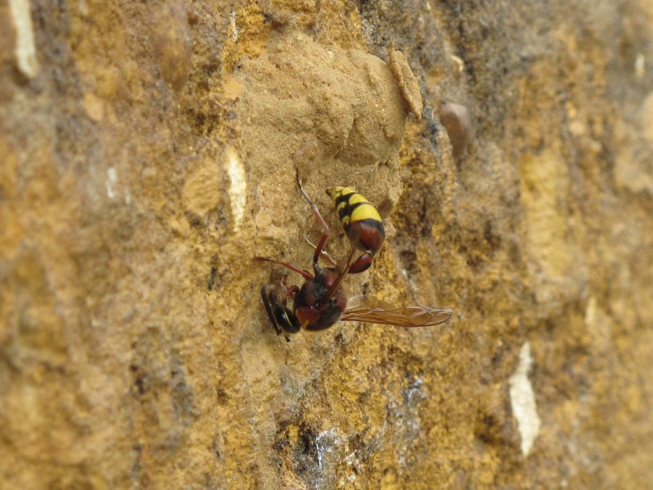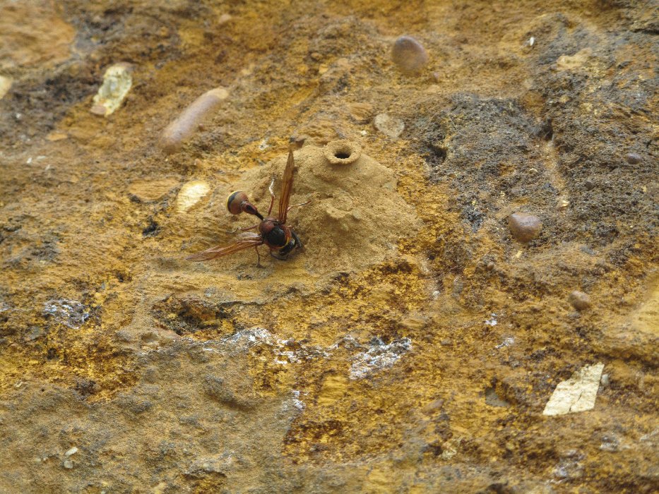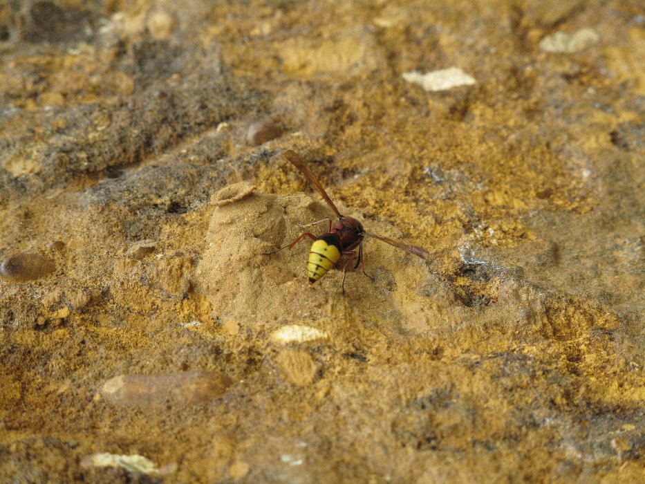 Femelle frelon qui construit une belle jarre pour ses oeufs, ou pour elle ? En tout cas, comme nous, elle prend soigneusement de la terre humide pour la façonner à sa guise.