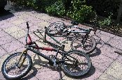 | bon, voila on avait décapé avec mon père un peugeot cpx 500... en dessous, il etait tout chromé pis, j'avais mis des stickers skyway, puis des mousses aussi, pour qu'il aille plus vite le machin... yeah, BMX !!! et ça c'est devant le shop de montero a Bordeaux |